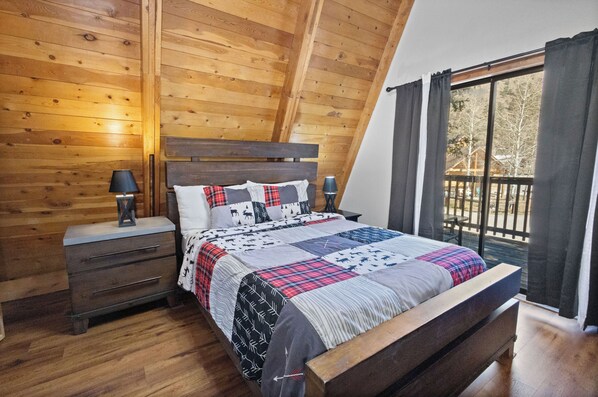 Master Suite: The second level boasts a stunning ski view with a Queen bed, a TV, and a private viewing deck, ideal for watching the skiers grace "The Face" or catching the Torchlight Parade on Saturday nights!