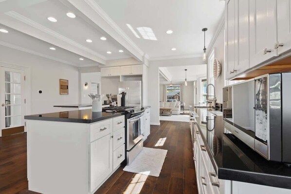 The open-concept living area provides a welcoming space to relax, and the fully equipped kitchen, with high-end appliances, is perfect for preparing meals together. The dining area offers ample seating for everyone to enjoy meals in style.