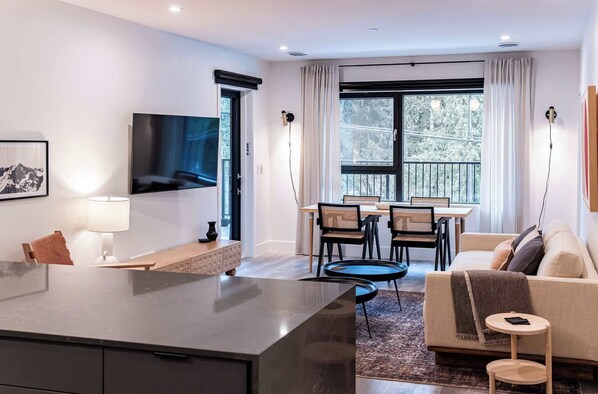 The open-concept living area is designed for relaxation and socializing. Unwind on the comfortable sofas as you hang out with friends and family, or catch up on your favourite shows on the flat-screen Smart TV. Large windows flood the space with natural light and offer stunning views of the surrounding landscape.