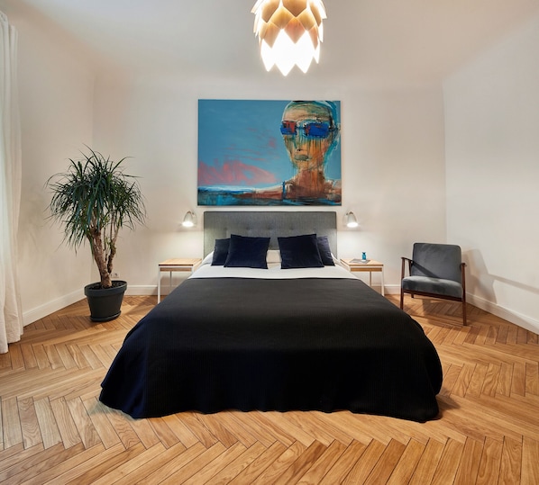 Rummelig soveværelse med trægulv og en luksuriøs king size seng med en fremragende madras og sengetøj af høj kvalitet, en bærbar venlig reception, et opholdsområde og HD-fladskærms-tv med satellitkanaler og Netflix.