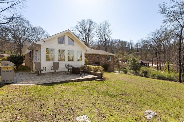 Home Layout: As you enter through the front door you will see a spacious and tastefully furnished sitting room to your right, as well as a dining room table that leads straight into the kitchen. The kitchen is well stocked with appliances and cooking utensils for your stay, as well as a coffee pot and medium roast coffee! Just off the kitchen is a short hallway leading to the back door that accesses the sun room, patio area, grill, and backyard. Back through the house you will find another comfortable living room with a fireplace and TV. Both bedrooms in the house have King sized beds, closet space, a TV, and private bathrooms.