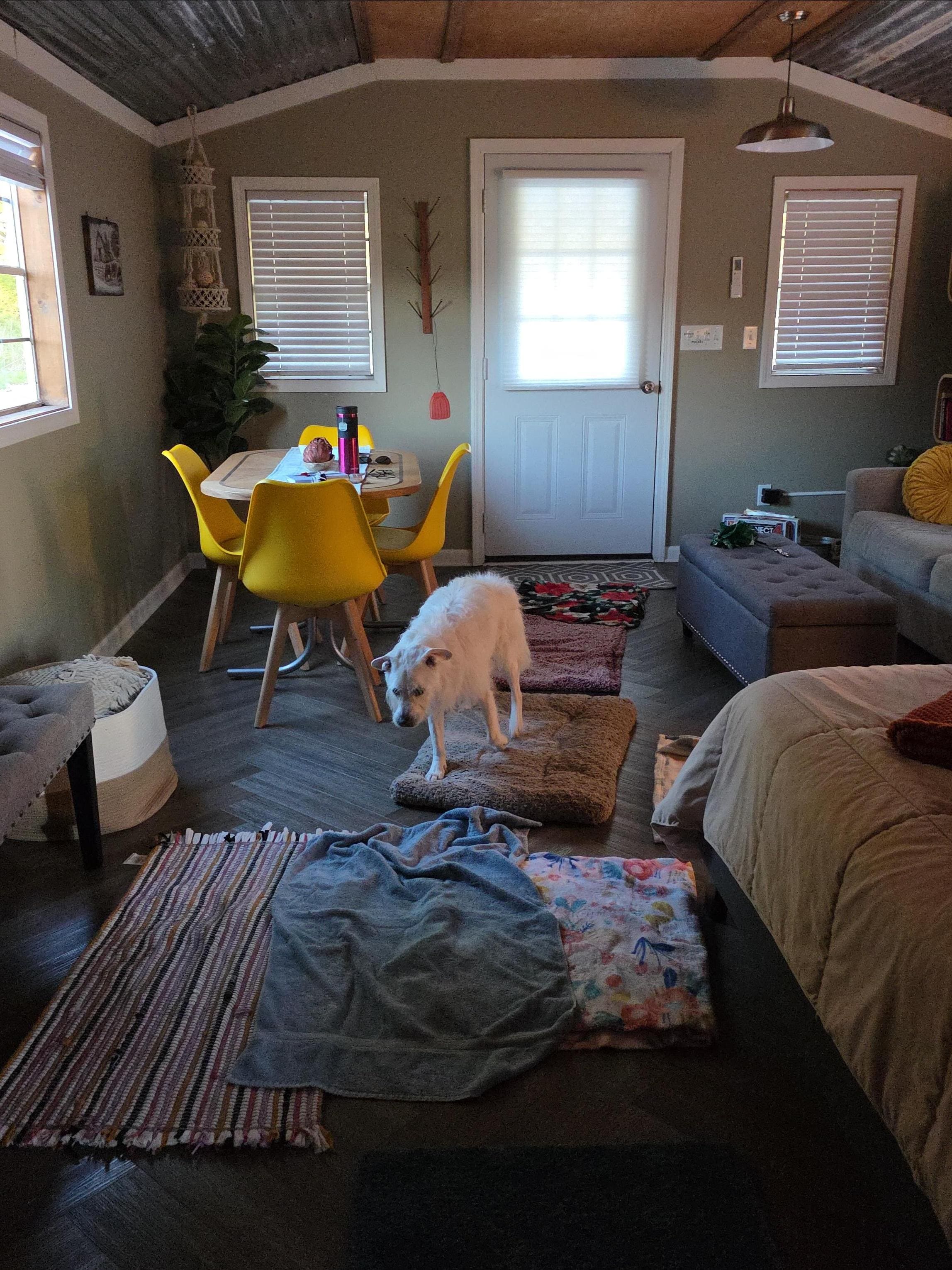 The property is equipped with a queen sized bed w/bamboo sheets, fold-out full-sized couch w/ bamboo sheets, extra blankets, Wi-Fi, Amazon Fire TV, Single serving coffee machine, toaster with mini cooking station, microwave, refrigerator, a dinette, an essential oil diffuser with a built in blue- tooth speaker, iron and ironing board, outdoor fire pit with grill and 4 adirondack chairs.