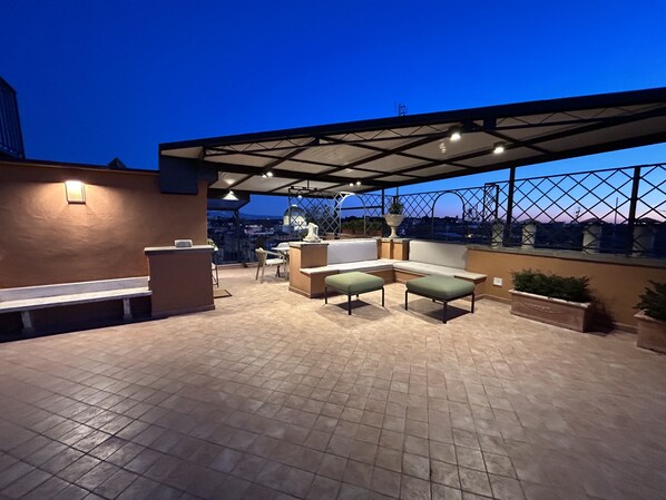 Located in an elegant building built at the end of the 19th century, Arenula16 is a luxury penthouse fully renovated in 2024. The home is spread over two levels: on the first level (sixth floor), there are 3 bedrooms, including two doubles and one with twin beds, 3 bathrooms with showers, a fully equipped kitchen, a living room with dining table, sofa, and flat-screen TV. On the second level (seventh floor), there is a dining room, a small kitchen, and a bathroom. From the second level guests have access to a panoramic terrace of approximately 100 square meters, for their exclusive use, offering a 360-degree view of the centre of Rome. The terrace is furnished with a table, chairs, sun loungers, BBQ and features night lighting.