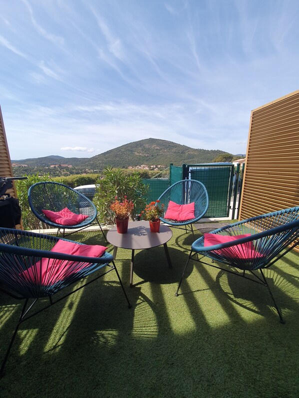 Bright T2 - Terrace with view of the hills - Air-conditioned + closed garage - beaches 5 min away