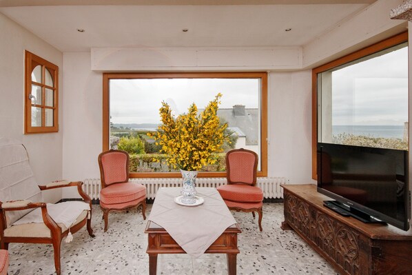 Cocoonr/Book&pay agency in Saint-Cast-le-Guildo offers this 120m² house with sea view for rent, which can accommodate up to 8 guests. It features an attractive 42m² living room, an open-plan fitted kitchen, four bedrooms, a bathroom (with shower and bath) and a vast 1,900m² enclosed garden. Wifi, bed linen and towels included, we're waiting for you!