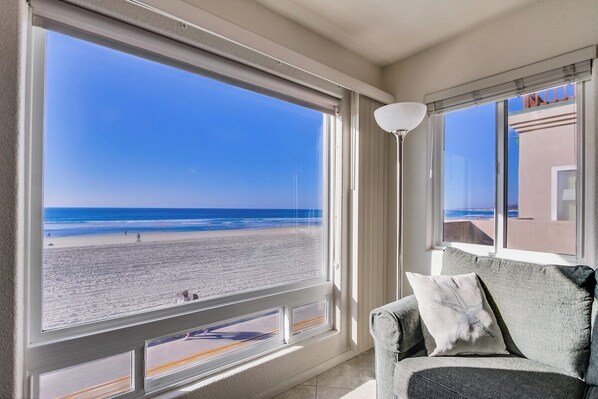 Denne lejlighed på anden sal ved havet ligger kun to blokke nord for Belmont Park i et otte-enhedskompleks. Det har 180 graders udsigt fra stuen og dronningen soveværelse og har sin egen private 10 x 13 tagterrasse. Gå ned ad trappen og hen over promenaden, og tæerne er i sandet. Nyd solnedgangen hver aften. På skyløse dage får du muligvis et glimt af den grønne flash! Mange gæster har rapporteret om at se delfin lege i bølgerne. Se, hør og lugt havet fra næsten hvert værelse i lejligheden. Se alle aktiviteterne på strandpromenaden eller deltag selv. Vi leverer to beach cruiser cykler, boogie boards, strandstole og parasoller. Tilbered middag i køkkenet eller på gas-grill og spis med udsigt over havet eller tag en dejlig tur til en af de mange lokale restauranter i området.