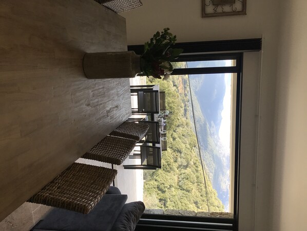 Det giver direkte adgang til overdækket terrasse. Den indeholder et stort bord, udendørs stole og en plancha.