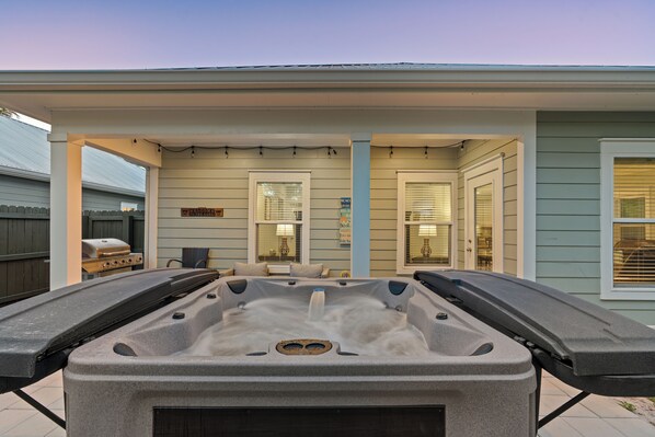 The kitchen is fully stocked for real cooking — not just reheating takeout — with an island that doubles as a prep station and a casual perch for coffee. The dining table seats six, and when the weather's good (which, around here, is most of the time), the covered back patio takes over as the real gathering spot. There's a hot tub out back for unwinding after long beach days, a gas grill for casual cookouts, and a fenced backyard that gives kids and dogs room to roam under the pines. A washer and dryer tucked near the mudroom means you can pack lighter, and the set of beach chairs and umbrellas waiting by the door means you can head straight to the sand without a stop at the store.