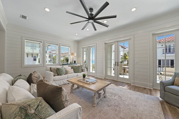 Find elegance at the beach with Arena Blanca from the moment you pull into the quaint, gated community to the high ceilings, spacious shiplap rooms, and calm color palette this gorgeous beach house has to offer. The main floor is on the second level and consists of a fabulous chef's kitchen stocked with Thermador appliances including a six burner gas range with griddle, large island and bar seating for four. White cabinets and stone counters bring an airy lightness to this amazing space. Next is a large dining table seating ten so the entire group can gather together for a meal. Moving to the living room, guests will find comfort and peace in this space with plush couches and chairs seating eight and a view out to the balcony. Out on the balcony is an ideal place to soak in the sun and relax with a view, cook out on the grill, or enjoy a meal al fresco!