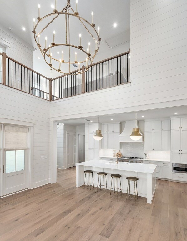With designer furnishings throughout this home, the coastal chic vibe sweeps you away when you first walk in and is captured in every detail. Boasting tons of natural light, white quartz countertops throughout the kitchen and all bathrooms, an open concept floor plan, kitchen island with breakfast bar and additional seating, stainless steel appliances, gas range, custom cabinetry and backsplash, and a charming yet comfortable vibe - no detail has been overlooked! Four king bedrooms and multiple exterior porches and lounging spaces make for plenty of room for multiple families vacationing together!