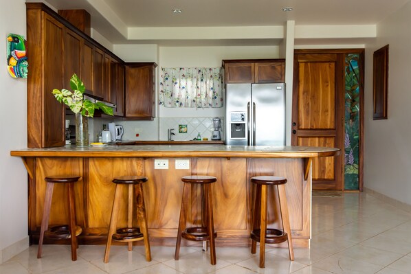 Køleskab, opvaskemaskine, elektrisk komfur, mikroovn, central aircondition, centralt vakuumsystem og tv.