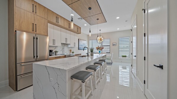 - Chef’s Kitchen: State-of-the-art appliances, sleek cabinetry, and a large island with seating, perfect for cooking and gatherings. Stocked with all the kitchen essentials you need for your stay.