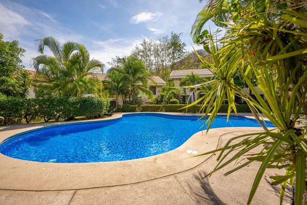 The highlight of this vacation rental is undoubtedly the outdoor area. Step out onto the walkway and you'll be greeted by a stunning community pool.