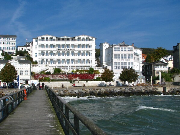 Den moderne lejlighed ligger den 3. Etage i en villa bygget i en markant badearkitektur, som byder dig velkommen direkte ved havet med en unik, fantastisk panoramaudsigt over Østersøen. Du bor direkte over den smukke strandpromenade i Sassnitz. Fra den 8 kvadratmeter sydvendte balkon har du en unik udsigt over Prorer Wiek. Sejlbåde, fiskerbåde, passagerskibe og de store færger paradeer for dig. Om aftenen hilser Greifswalder Oie fyrtårn og lysene fra Binz, Sellin og Göhren dig.