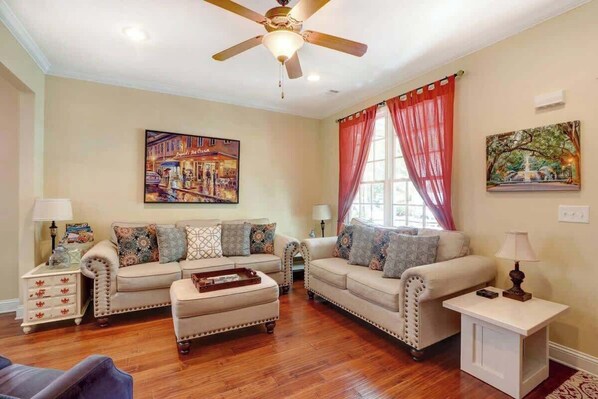 Dette søde sommerhus ligger lige ved Park Avenue kun 2 gader væk fra den berømte Forsyth Park! Kom rock eller sving med os på verandaen og nyd den sydlige livsstil. Vores traditionelle design og varme indretning byder dig velkommen til at sparke op, slappe af og føle dig hjemme. Denne ejendom kan prale af en meget rummelig bagplads, der er helt overdækket og perfekt til at nyde det smukke vejr, samtidig med at man bevarer det samlede privatliv. Vi byder velkommen til ALLE samfundslag! ** Leveres med GRATIS adgang til fitnesscenter under dit ophold **