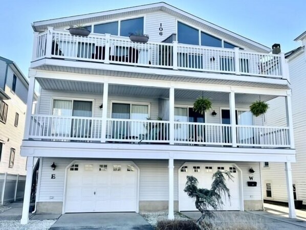 Ocean views from the deck of this townhouse. 4 bedrooms, 2 full baths plus outside shower. Full garage plus off street parking. Central air. Spacious home VERY close to the beach! Also close to Promenade, shopping, etc. First floor features 3 bedrooms and one full bathroom. One bedroom features 2-twin beds, another features a queen bed and the final bedroom features a king bed with private deck. Top floor features the spacious great room and one bedroom that consists of a pyramid bed (twin over a full), along with another twin bed and private deck. There is also a full bath on this floor. Book this unit today as it will not last long.