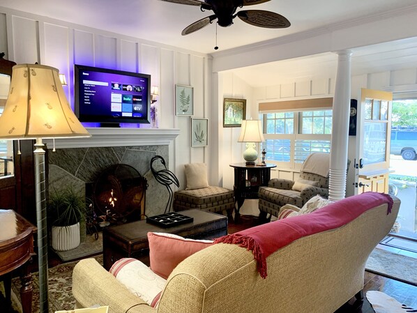 * Stuen har en gas pejs for de nætter, når du vil nyde aftenen ved ilden. Vi tilbyder 40 "fladskærms-tv og dvd-afspiller over pejsen. I stuen er der mange vinduer, der giver vidunderlige briser og lyser ind i dette meget afslappende værelse. Masser af plads til familien TV nat eller ferie samtaler om dagen på stranden. Dette værelse har dobbelt sovesofa med sovesofa.