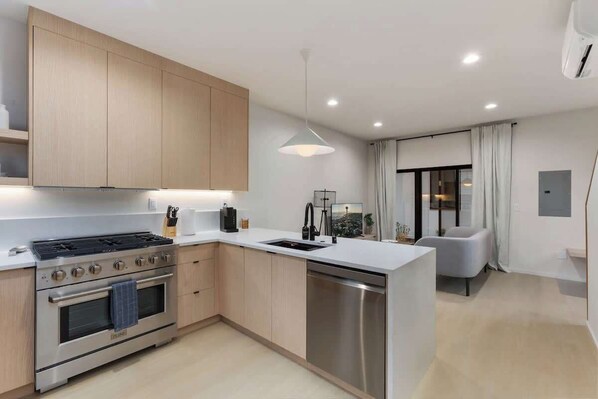 Step into an open-concept living room, dining area, and gourmet kitchen with sleek cabinetry, quartz countertops, and a gas range. Natural light fills the space and a mini-split provides year-round comfort. A convenient powder room is also located on this level.