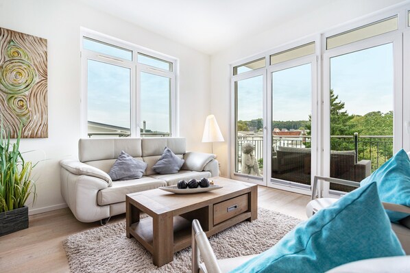The apartment has two balconies with garden views, a satellite flat-screen TV, a well-equipped kitchen with refrigerator, dishwasher, and oven, as well as two bathrooms with bidet and hairdryer. Just a few minutes' walk away, at the upper end of Wilhelmstraße, you will find both the main beach of the famous Baltic Sea resort and the elaborately reconstructed Sellin pier. This legendary, 394-metre-long structure with its magnificent pavilions invites you to linger in style both in summer and winter. The charming surroundings offer numerous excursion options, including the wide South Beach, Selliner See, the spectacular cliffs, the traditional fishing villages of the Mönchgut peninsula and the Southeast Rügen Biosphere Reserve, as well as the impressive Granitz hunting lodge.