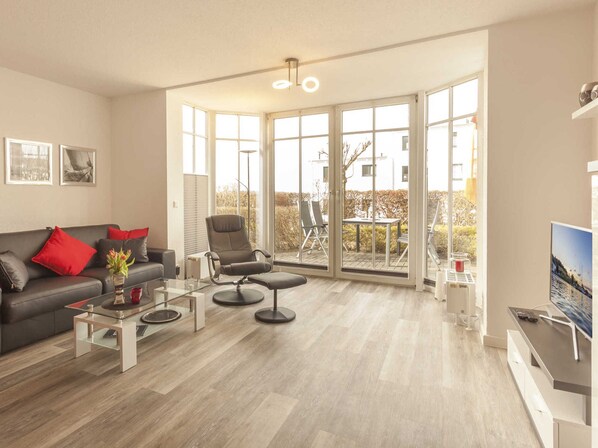 Den stilfulde lejlighed er beliggende i et lejlighedskompleks i en rolig beliggenhed i badebyen Sellin. Over en lille bakke kan nås på omkring 700m, sandstranden. Også centrum af Sellin er let nås på cirka 1,4 kilometer til fods. Lejligheden har 1 soveværelse, stue (inkl. Sovesofa til 2 personer), køkken, badeværelse og terrasse og er på jorden i huset. Du kan komme til lejligheden via terrassen og er derfor også egnet til kørestole. Via indgangen til huset kan du nå lejligheden via en trappe.