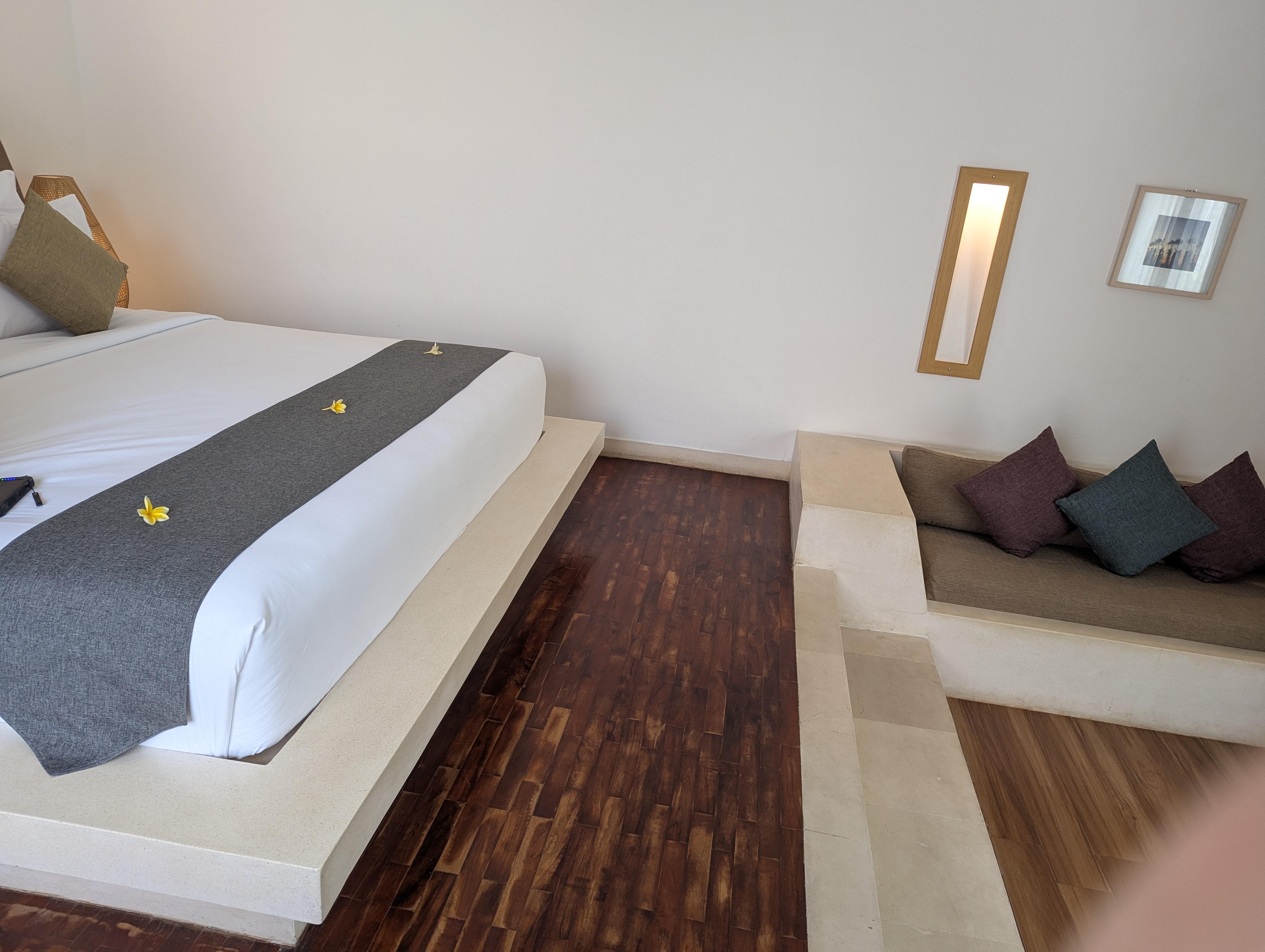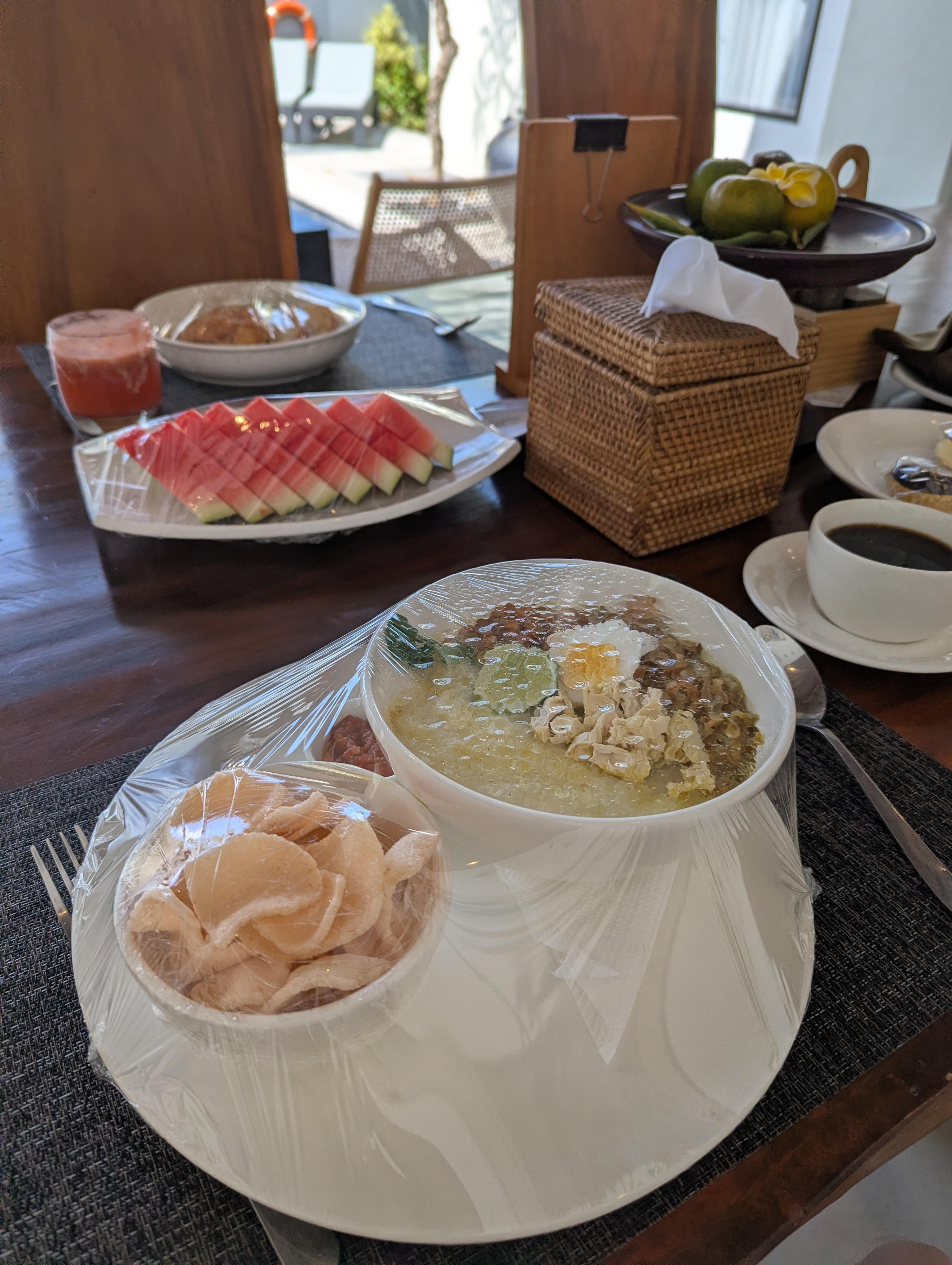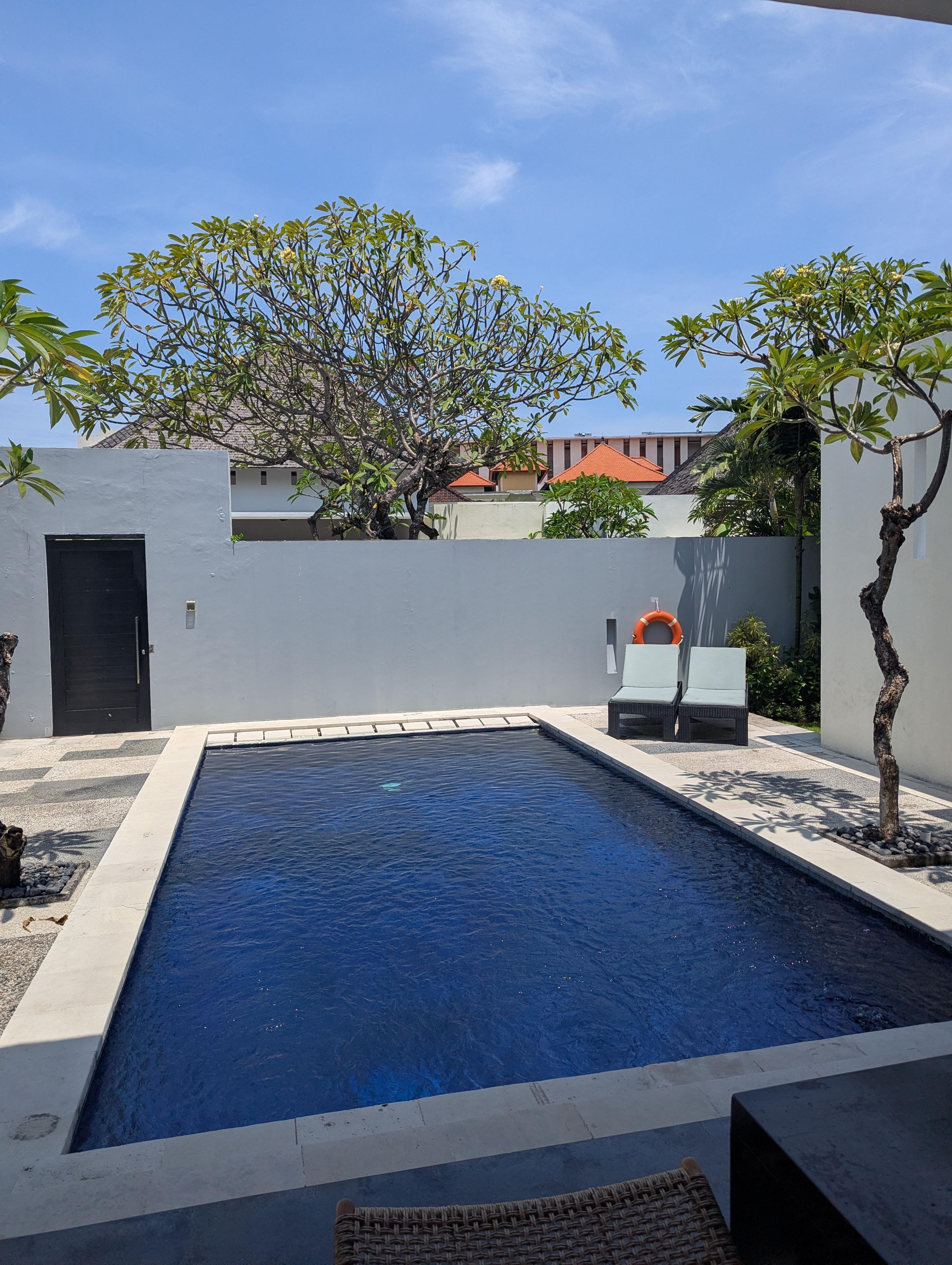 Amazing experience overall. The staff were friendly and communication (English spoken/WhatsApp) was excellent. I booked the very well priced airport transfer both ways which went smoothly with welcome drinks and snacks on arrival in the car. The daily breakfast had a great selection to choose from which they prepare in your villa at your chosen time. The villa itself was gorgeous. Spacious with a large clean pool and living/common space. The rooms had a large bathroom each (2bdr villa) with a huge sunken bathtub complete with bath salts and body scrubs as well as rain shower head on the side. Daily housekeeping provided at your chosen time as well. Located in Seminyak with a great massage place (Kimberly spa) right opposite and a supermarket just 5min walk away. Popular destinations for food (mades warung) , Seminyak square, la favela etc just a 10min bike ride away. Highly recommend!