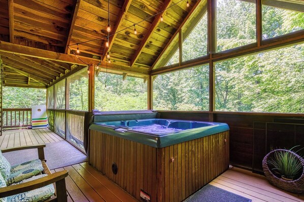 The Queen bedroom on the main floor offers a flat-screen TV and connects to a bathroom that conveniently opens back up to the living room. Step through the dining room to discover the back screened-in porch, featuring a spacious hot tub where you can unwind and soak in the serene surroundings.