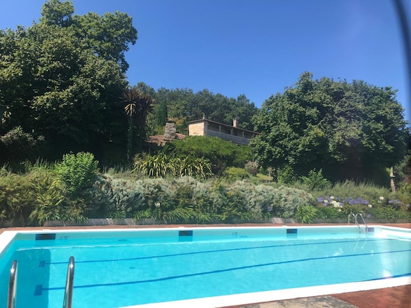 Landejendom med en udendørs pool og en restaurant i Silleda