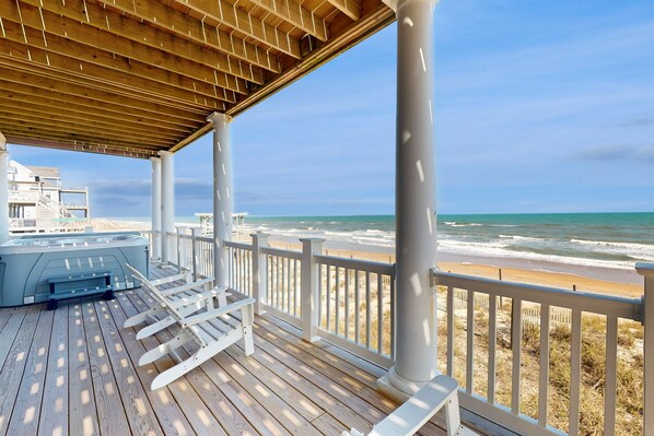 Sitting all by itself on the oceanfront, you will enjoy plenty of peace and quiet at this gorgeous, beachfront home. With seven bedrooms and baths, you will certainly have a wonderful friends' and family vacation at this inviting home! You will appreciate the whole-home elevator making groceries and luggage a simple chore and a hot tub on the deck, to caress away any remaining stress with its warm water and bubbling jets.