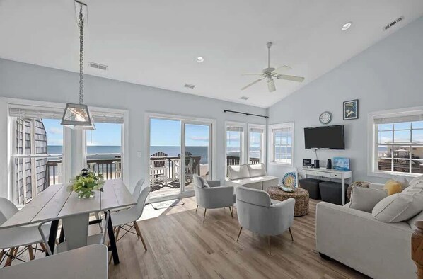 The open-concept living area is light and breezy, with large windows framing the endless blue of the Atlantic. Comfortable coastal furnishings invite you to sink in after a beach day, whether for movie nights or quiet reading with the waves as your soundtrack.