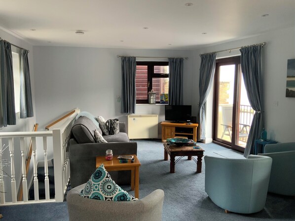 En omvendt plan ejendom. Nedenunder er der 2 soveværelser, en dobbeltseng og et med to enkeltsenge plus et badeværelse for nylig blevet renoveret med toilet, rummelig bruser og håndvask. En trappe går ovenpå til et åbent plan værelse, der har et tæppet siddeområde med en stol og en 2 sofaer, der er en dobbeltseng plus en læder drejestol. Sittegruppen har udsigt over havet, herunder fyrtårnet og havmur. Franske døre åbner ud mod en balkon med et bord og to stole igen med havudsigt. Det åbne plan værelse har et stort træ spisebord med seks stole. Køkkenet er veludstyret med madlavning udstyr porslin og bestik til seks personer. Der er en indbygget elektrisk ovn og induktionskogeplade med en integreret skorsten, en 8. 1 cu. ft. fuldt integreret køleskab, fryser, opvaskemaskine, mikrobølgeovn, langsom komfur, brødrister, kedel og vaskemaskine tørretumbler. Køkken og spiseplads har et trægulv for nem vedligeholdelse. Der er en DAB / FM-radio, et fjernsyn med adgang til Freeview-kanaler og internetadgang. Der er en multi region dvd-afspiller til rådighed med et udvalg af dvd'er.