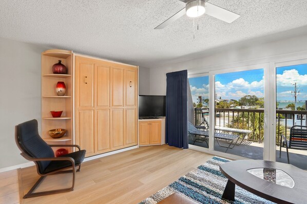 - Flat screen TV, ceiling fan, and 100 sq ft balcony with Bay view