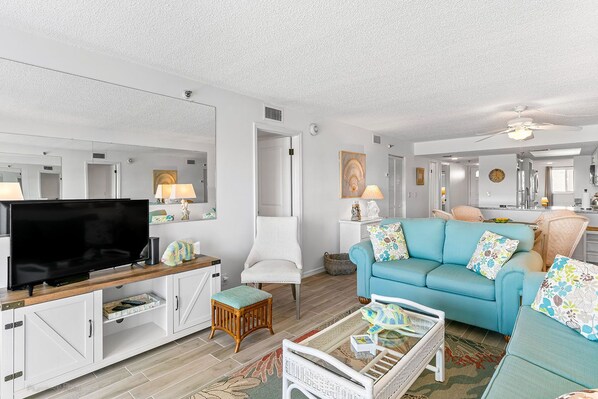 We would stay again. Everything was clean and neat and the space served our needs. We enjoyed sitting out on the deck and watching dolphins right from our balcony! The unit was well equipped. We have tall kids, so I wish more people would do XL twins to allow for a broader range of comfort for more guests. I know they put mattress protectors on for a reason - but they were the kind that krinkle when you move and were hot to sleep on so would have liked those to be different. I didn't like having to go to the office to check in - especially sitting in traffic to get up there, but I will say the staff were extremely pleasant and helpful with providing additional information.