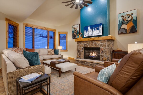 This luxury ski in-ski out 4 BD / 4 BA residence sleeps 10 and boasts dramatic views of Mt. Werner and the Yampa Valley from its primary bedroom, living spaces and covered deck. It was recently updated (Fall 2025) by an award winning designer with gorgeous hardwood flooring, tasteful artwork, fresh premium paint, comfortable furniture including a dining room table that seats 8 and a new air-conditioning system. The great room features a gas fireplace, large new sofa, reclining accent chairs, and a 75 inch Samsung Frame flat screen TV and is perfect for family meals prepared in the well equipped and spacious kitchen complete with top-of-the-line stainless steel appliances.