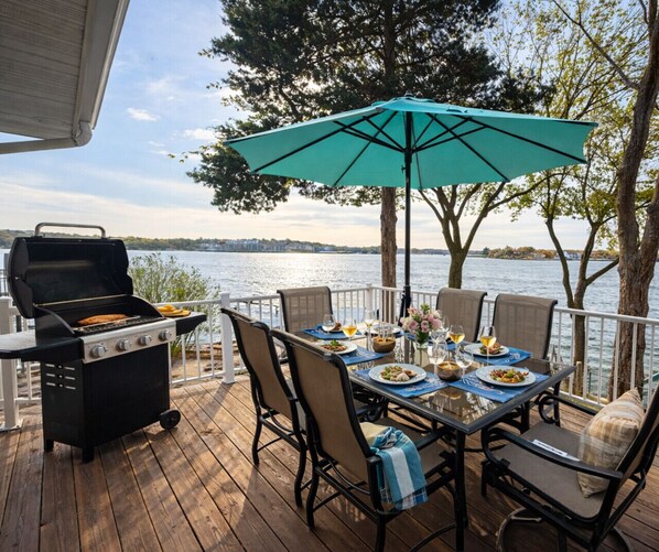 The upper deck includes outdoor dining and a grill—perfect for sunset dinners