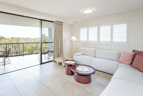 → Large open-plan living and dining area opening onto a private balcony with ocean views.