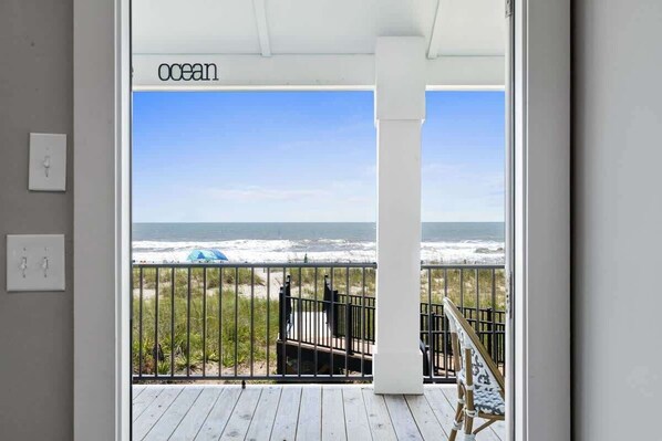 Step outside onto the extra-large 10 x 40 covered porch that overlooks the ocean. Privacy walls on each side ensure a secluded and intimate setting. Here, you can relax on the cozy outdoor sectional or gather around the table for a meal. The porch also features a large dining table with chairs and 11 hooks on the privacy wall for hanging towels, bags, and other beach essentials. Recently added life size connect four and table tennis!