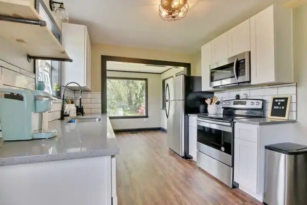 Relax and enjoy this 3 bedroom (the upstairs loft has a futon/sofa bed in addition to a queen size bed), 1 bath home in Tacoma. We renovated the kitchen but kept the charm of this old house. Since these photos were taken, a 6 ft cedar fence was installed around the house (not pictured but photos will be updated). Some of the furniture photographed here may not be the same. Private parking (driveway), fully fenced in backyard, Wi-Fi+ close to both I-5 and 512 (freeway).