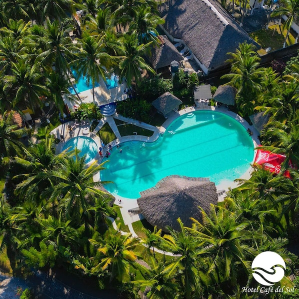 2 udendørs pools og en børnepool samt en bar i poolen
