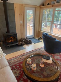 My husband and i fell in love with this gorgeous cabin in the woods with ocean/tides view . This place was brand new and wow it was like joanna Gaines from magnolia channel decorated it and designed the features and layout, straight out of a magazine dream So stunning blonde wood floors and pale pine ( i think walls .high ceilings every room was so charming and beautiful and clean wow now for the views floor to ceiling windows and skylights looking at the pine trees and ocean cove with the most spectacular sunrise so private and romantic and close about 20 min to the beautiful towns of Camden and Rockport close to so many great places but so amazing of a place that you got to spend that time there to soaking up pure beauty! Kitchen and bathroom perfect and a really cozy comfortable second floor tv room too . The lowere level is warmed by a wood burning stove that was perfect ! We had some beautiful fires in there but took great care and respect to be safe and keep things clean including opening the windows when first bldg the fire to not let the little bit of smoke that happens when you first start to build it with the door open . So everything stays fresh . The windows open easily and we enjoyed the fragrant fresh air while drinking our coffee in the mornings We didn’t want to leave and we will be back ! And we took the sieger cabin back to Cleveland with us in our hearts
