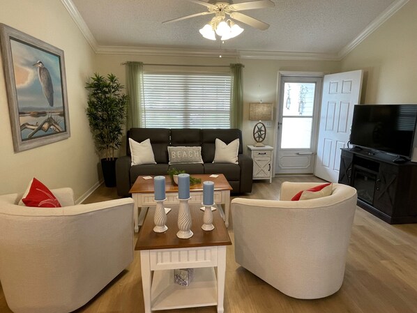 The living room is warm and welcoming, featuring an electric fireplace that creates instant ambiance. A large 55" TV anchors the space, making it perfect for cozy movie nights or relaxing after a day of exploring. Beautiful laminate flooring runs throughout the home—no carpet anywhere—keeping things clean, fresh, and easy to maintain.
