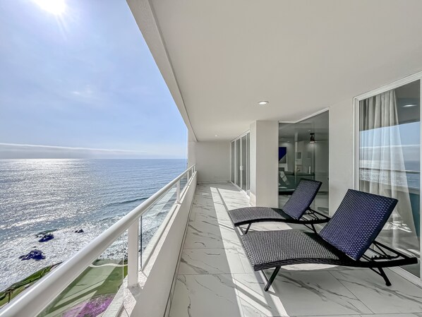-Oceanfront Living: Enjoy stunning views from floor-to-ceiling windows and a private balcony.