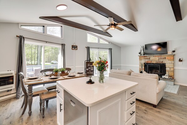 Outdoor adventure awaits at this Tobyhanna vacation rental! With a serene tree-lined setting, fishing spots, golf courses, and more at your fingertips, this 3-bedroom, 1.5-bath house makes the perfect base for a memorable stay with family or friends. Visit Kalahari Indoor Waterpark or try your luck at Mount Airy Casino before heading home to play yard games and barbecue.