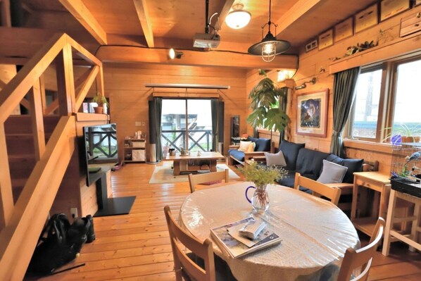You can use all of the space on the 2nd floor / A log house with a wood stove and a simple band studio The bath half unit is for guests only
