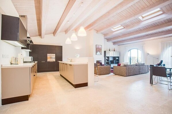 The ceiling of the living room is sloped and is made of wood. The furnishings are cozy and comfortable, and include two sofas and a chaise longue. There is a small fireplace. In the living room you will also find a cooking area. The kitchenette is equipped with a four-burner gas cooker, an electric oven, a refrigerator with freezer, a dishwasher, a microwave oven, an Italian-style coffee-maker, an American-style coffee-maker and a kettle. The dining table can accommodate six guests. In this room you will find a satellite television (local channels). From the living room you will be able to enter the patio and the garden through two French doors. The room is equipped with underfloor cooling.