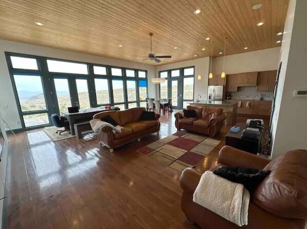 modern new build. Large open concept. Large spacious rooms. Tall ceilings. Wood flooring and ceiling. Lots of windows for great views of the Lake, The dam and the Elephant Butte.