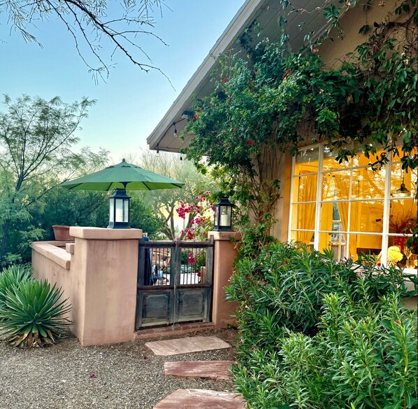 I stil med de gamle fodgænger bringer denne elegante casita dig al den varme, fornøjelse og atmosfære i ørkenen og giver dig alligevel bekvemmeligheden ved at være inden for få minutter fra alle Tucsons mest ønskelige seværdigheder. Privat beliggende på samme grund som hovedhuset, en vidunderlig lukket gårdhave med udsigt over Santa Catalina-bjergene og er omgivet af Sonoran-ørkenen. Hvert værelse har en vidunderlig udsigt over ørkenen og rigeligt naturligt lys. Med brede plankegulve, orientalske tæpper sammen med moderne moderne møbler, en åben grundplan, fremragende belysning og original kunst, er casita indbydende og behagelig.