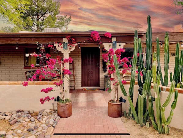 A thoughtfully curated 1600 sq ft home with 3 bedrooms and 2 bathrooms on a beautifully landscaped corner lot. Two separate living rooms, full kitchen, three dining areas, covered front porch, seasonal hot tub, bike port and a covered back patio with mountain views of Mt Lemmon.