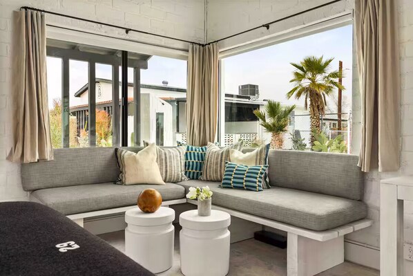 King Apartment 6 is a spacious 360 sq ft / 33 m2 retreat with a king bed, built in custom seating, Frame TV, and a kitchenette. The bathroom includes an unlacquered brass rain shower, premium toiletries, and our signature 29 tile floors.