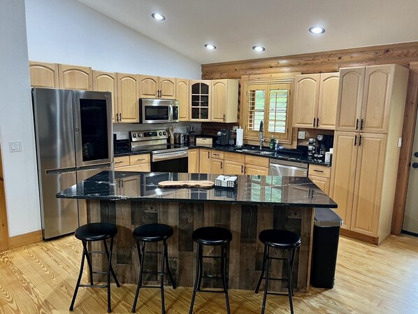 Fully equipped kitchen with granite countertops, very spacious kitchen island with seating, Nespresso coffee maker, drip coffee maker and everything else you may need for all your cooking needs.