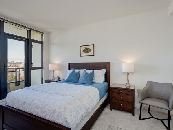 The suite features a welcoming entryway with two large closets, high 9-ft ceilings, and six closets throughout for ample storage — ideal for longer stays. The primary bedroom includes solid wood furnishings and a cozy lounge chair, while both bedrooms offer high-quality queen beds and generous closet space.